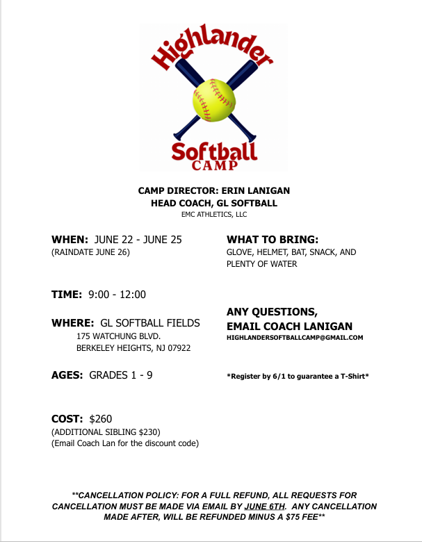 QUESTIONS: Email Coach Lanigan at highlandersoftballcamp@gmail.com
